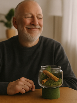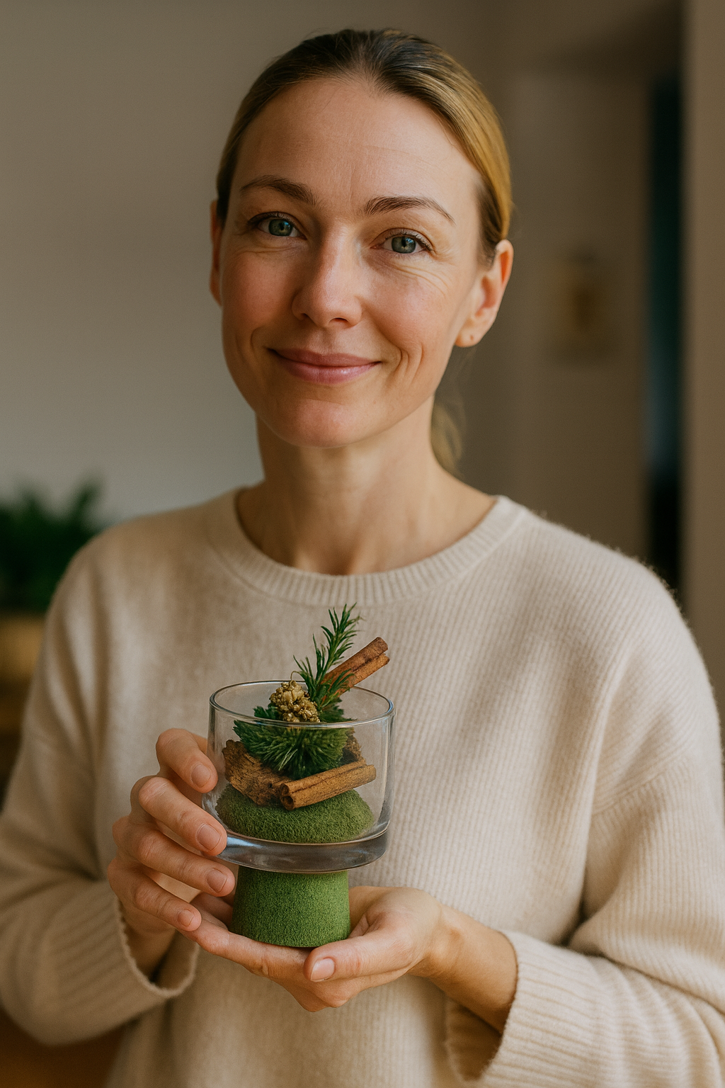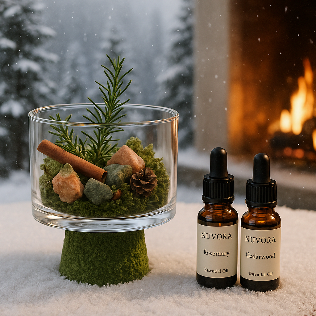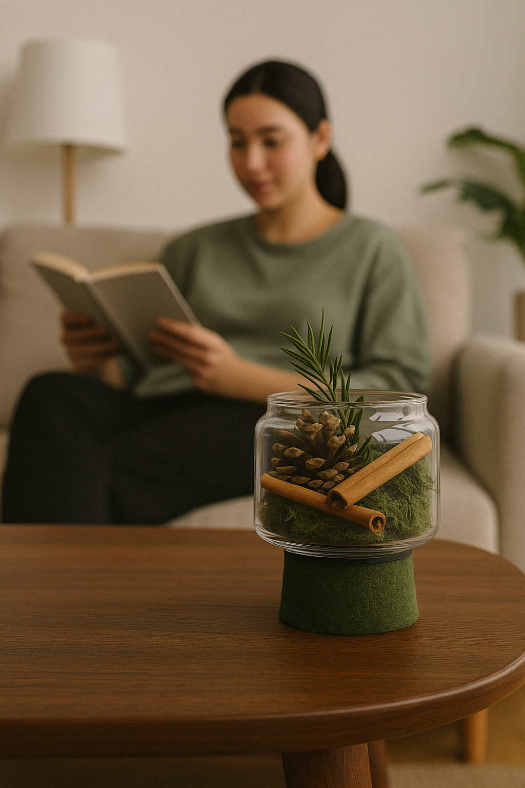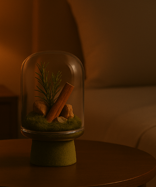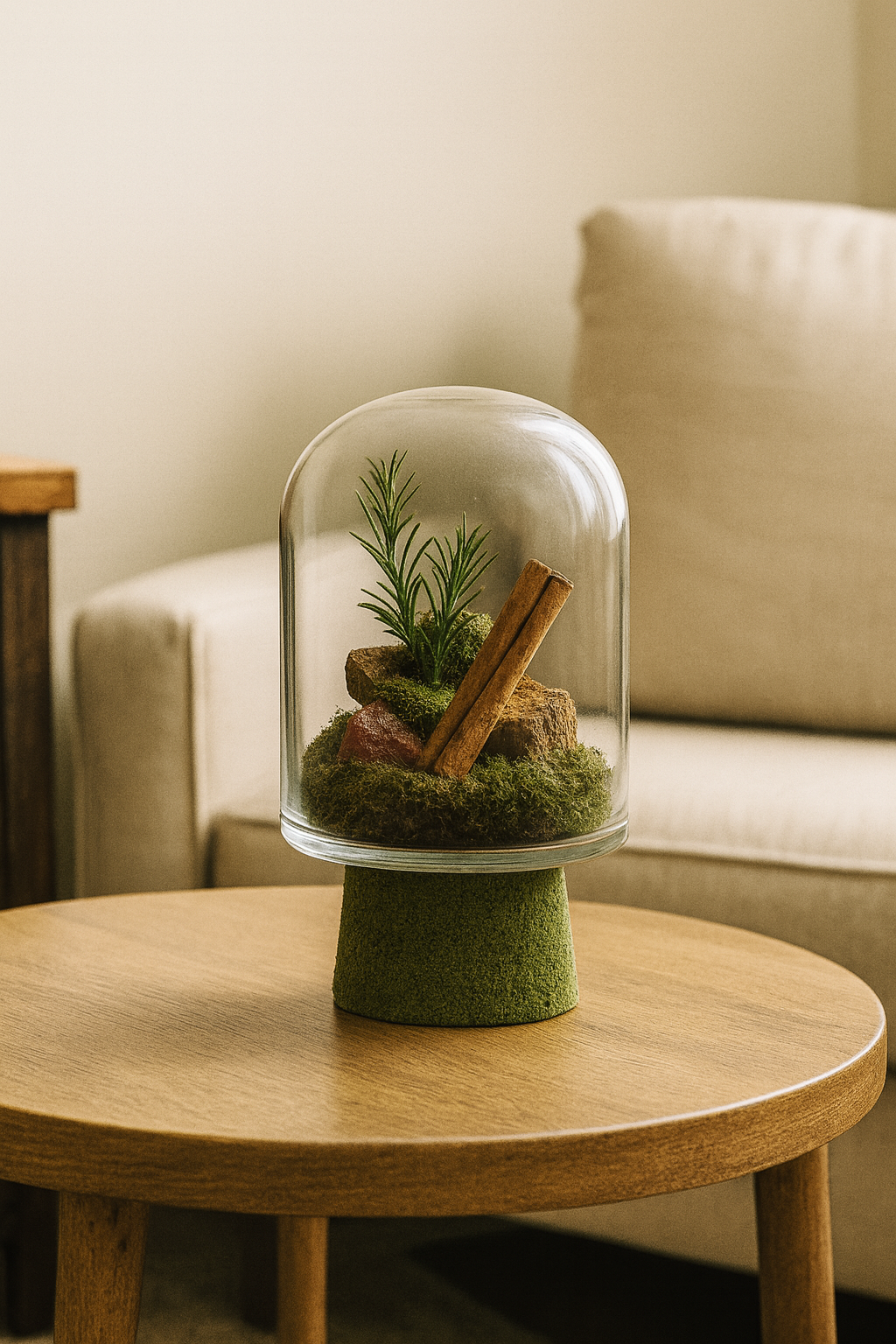 Add a few drops of essential oil to the botanicals, replace the dome, and let it diffuse naturally. Wipe the glass gently as needed.